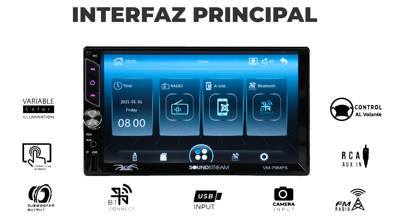 Disfrutá un sonido potente y una experiencia multimedia completa con el Soundstream VM-79MPS, la radio 2 DIN con pantalla LED de 7 pulgadas, Bluetooth y reproducción USB de hasta 64 GB.
